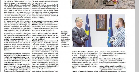 Ministri i Integrimit Evropian, Bekim Çollaku, është intervistuar nga gazeta gjermane “Handelsblatt” lidhur me migrimin dhe perspektivën evropiane të Kosovës së bashku me një të ri nga Kosova që kishte migruar ilegalisht në Gjermani për t’u kthyer pas pak muajsh në Kosovë. Intervista është zhvilluar në formë të dialogut në mes të ministrit dhe qytetarit, Granit Azemi(27) dhe ajo transmetohet nga gazetaexpress.com
