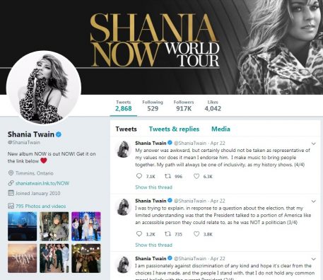E, pas këtyre fjalëve, në mediat sociale fansat filluan ta kritikojnë. Më pas, Twain reagoi, duke thënë se komentet e bëra nuk përfaqësojnë vlerat e saj.