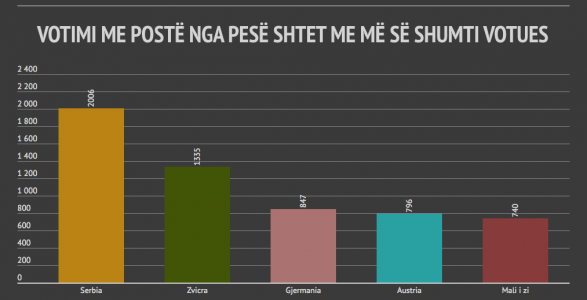 Numri më i madh i votuesve jashtë vendit, për dallim nga zgjedhjet nacionale ku kishim më së shumti votues nga Zvicra, kësaj here numri më i madh vie nga Serbia me 2006 vota. Pas Serbisë është Zvicra me 1335 vota, duke e lënë pas Gjermaninë me 847 fletëvotime.