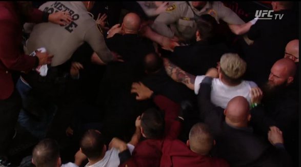 E gjithë kjo krijoi kaos në kafaz e jashtë saj, ku u përfshinë edhe stafet e dy sportistëve e forcat e rendit, që ndërhynë për të qetësuar gjakrat, madje pati edhe goditje të dy sportistëve.