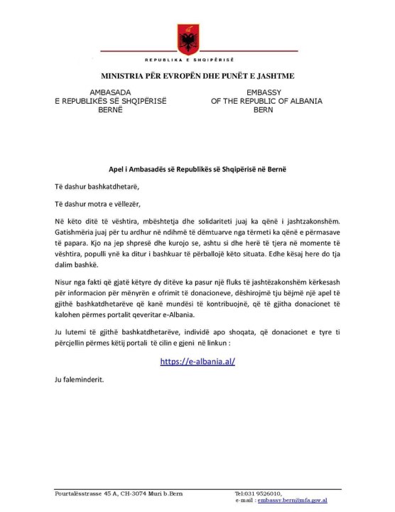 Përmes një shkrimi në faqen e saj zyrtare, Ambasada e Shqipërisë në Bernë, ka njoftuar të gjithë bashkëatdhetarët për mënyrën se si mund të ndihmojnë familjet që u prekën nga termeti në Shqipëri, shkruan albinfo.ch.