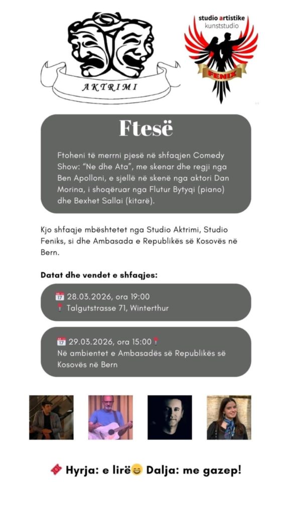 Shfaqjet do të mbahen më 28 mars në Winterthur (ora 19:00) dhe më 29 mars në Bern, në ambientet e Ambasadës së Republikës së Kosovës (ora 15:00).