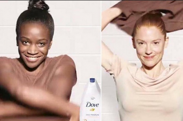 Reklama e publikuar të shtunën tregoi katër fotografi – dy nga to që tregonin një grua me ngjyrë teksa hiqte fanellën e saj dhe “kthehej” në një grua të bardhë. Një shishe e “Dove” ishte në qosh të reklamës.