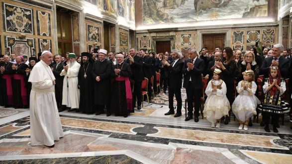 Në fjalën e tij përshëndetëse Papa Françesku tha: Sot, kujtojmë e kremtojmë Gjergj Kastriotin Skënderbeun, bir heroik i një populli të fortë e bujar, që mbrojti me guxim vlerat shpirtërore dhe emrin e krishterë, aq sa të meritonte titullin “Athleta Christi”. Me veprat e tij farkëtoi identitetin kulturor shqiptar, duke u bërë simbol i padiskutueshëm lidhjeje dhe bashkimi kombëtar, si edhe interpretues në nivelin më të lartë të vlerave të besnikërisë së ndershme ndaj impenjimeve të ndërmarra lirisht”.