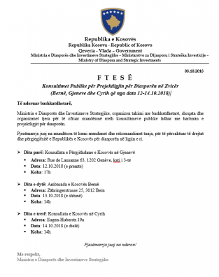 Ambasada e Kosovës në Bernë ka njoftuar se nga 12 deri më 14 tetor do të mbahen konsultime publike për projektligjin për diasporën tonë në Zvicër. Konsultimet do të mbahen në Gjenevë, Bernë dhe Cyrih, shkruan albinfo.ch.
