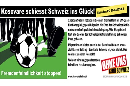 Si Xherdan Shaqiri janë shumë futbollistë tjerë që luajnë për kombëtaren zvicerane, të cilët kanë lindur pa pasaporta zvicerane”, thuhet mes tjerash në afishet e UNIA-s.