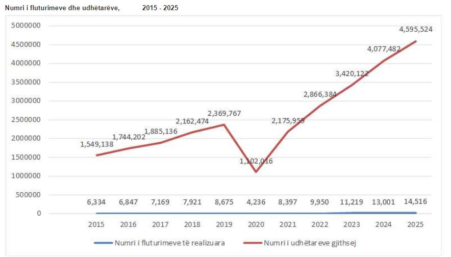 Numri i fluturimeve në vitin 2025 arriti në 14,516 apo 11.7% më shumë se në vitin 2024, ndërsa numri i udhëtarëve, mbi 4.5 milionë apo 12.7% plus