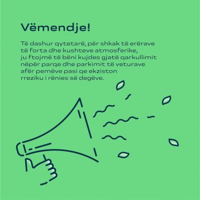 “Ju lutemi, keni kujdes gjatë ecjes në parqe, afër pemëve apo objekteve të larta, mos kaloni afër tyre për shkak të erërave të forta, të cilat po fryjnë me shpejtësi 70km/h”, thuhet në njoftimin e komunës.