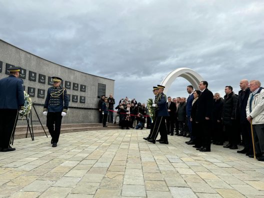 Kryeministri i Kosovës, Albin Kurti, Presidentja Vjosa Osmani dhe kryetari i Kuvendit të Kosovës, Glauk Konjufca, ishin të shoqëruar edhe nga ish-shefi i OSBE-së, William Walker. Ata vendosën kurora me lule.
