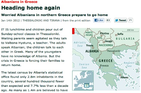 Shqiptarët në Greqi marrin sërish rrugën e shtepisë. The Economist sjellë shembuj familjesh që mendojnë kthimin edhe pse fëmijet e tyre kanë lindur në Greqi e njëri-tjetrit, i flasin në gjuhën e atjeshme.
