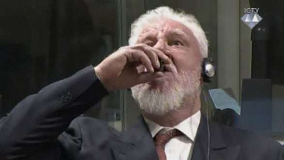 Praljak u ngrit në këmbë dhe e ngriti dorën tek goja e tij, e lëkundi kokën prapa dhe u duk se përpiu një gotë me diçka në të, e që, sipas avokatit të tij, ishte helm, derisa lajmi nuk është konfirmuar zyrtarisht.