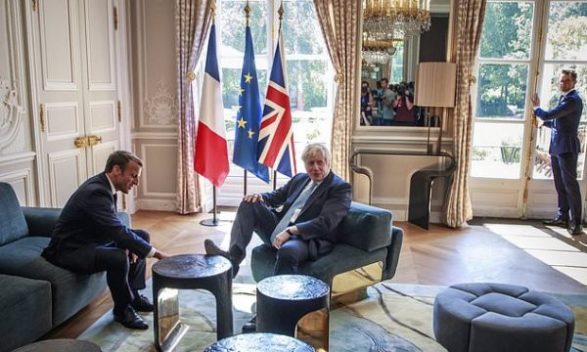 Boris Johnson është fotografuar duke vendosur këmbën e tij në një tryezë në Pallatin Elysee të Francës gjatë bisedimeve për Brexit me presidentin francez, Emmanuel Macron.