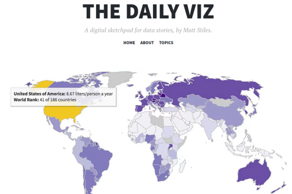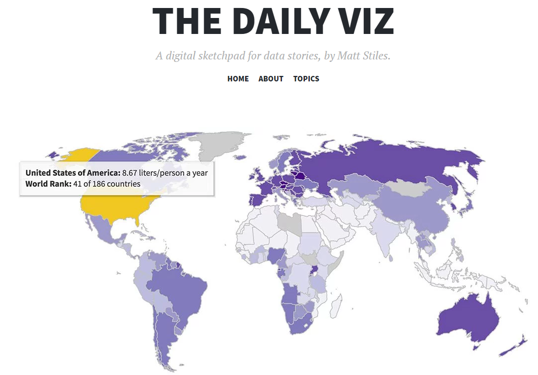 Matt Stiles nga "The Daily Viz" ka projektuar një hartë të detajuar të konsumit të alkoolit për frymë në çdo vend.