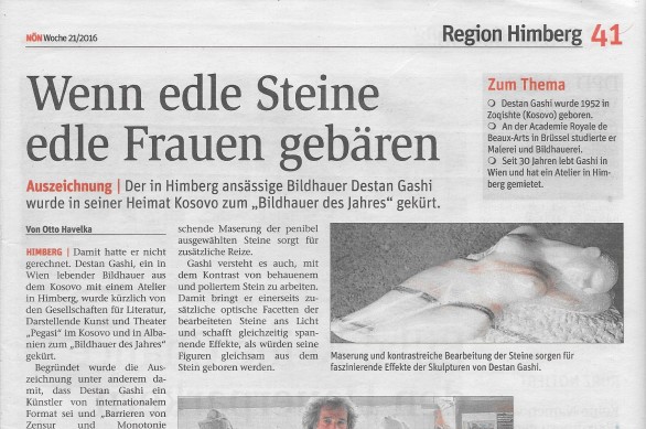 Gazeta austriake “NÖN” i ka kushtuar javen e kaluar një hapësirë të konsiderueshme skulptorit shqiptar Destan Gashi. Skulptori nga Himbergu Destan Gashi u kurorëzua në vendlindjen e tij Kosovë si „Skulptor i vitit“