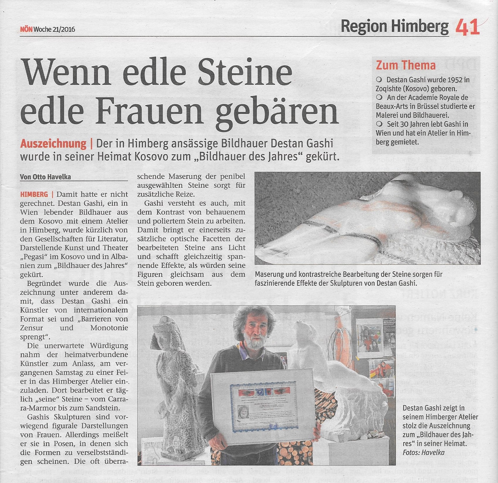 Gazeta austriake “NÖN” i ka kushtuar javen e kaluar një hapësirë të konsiderueshme skulptorit shqiptar Destan Gashi. Skulptori nga Himbergu Destan Gashi u kurorëzua në vendlindjen e tij Kosovë si „Skulptor i vitit“