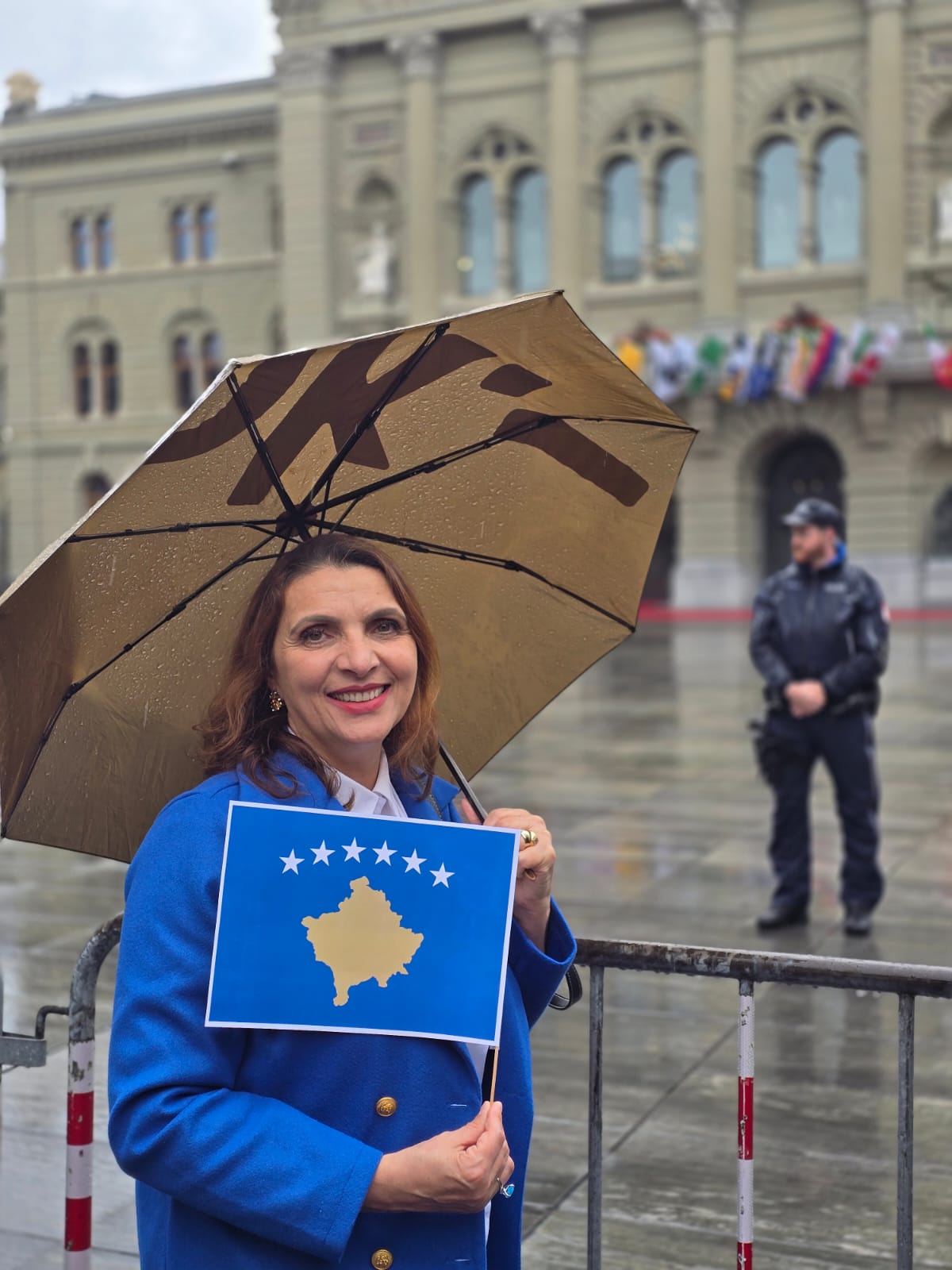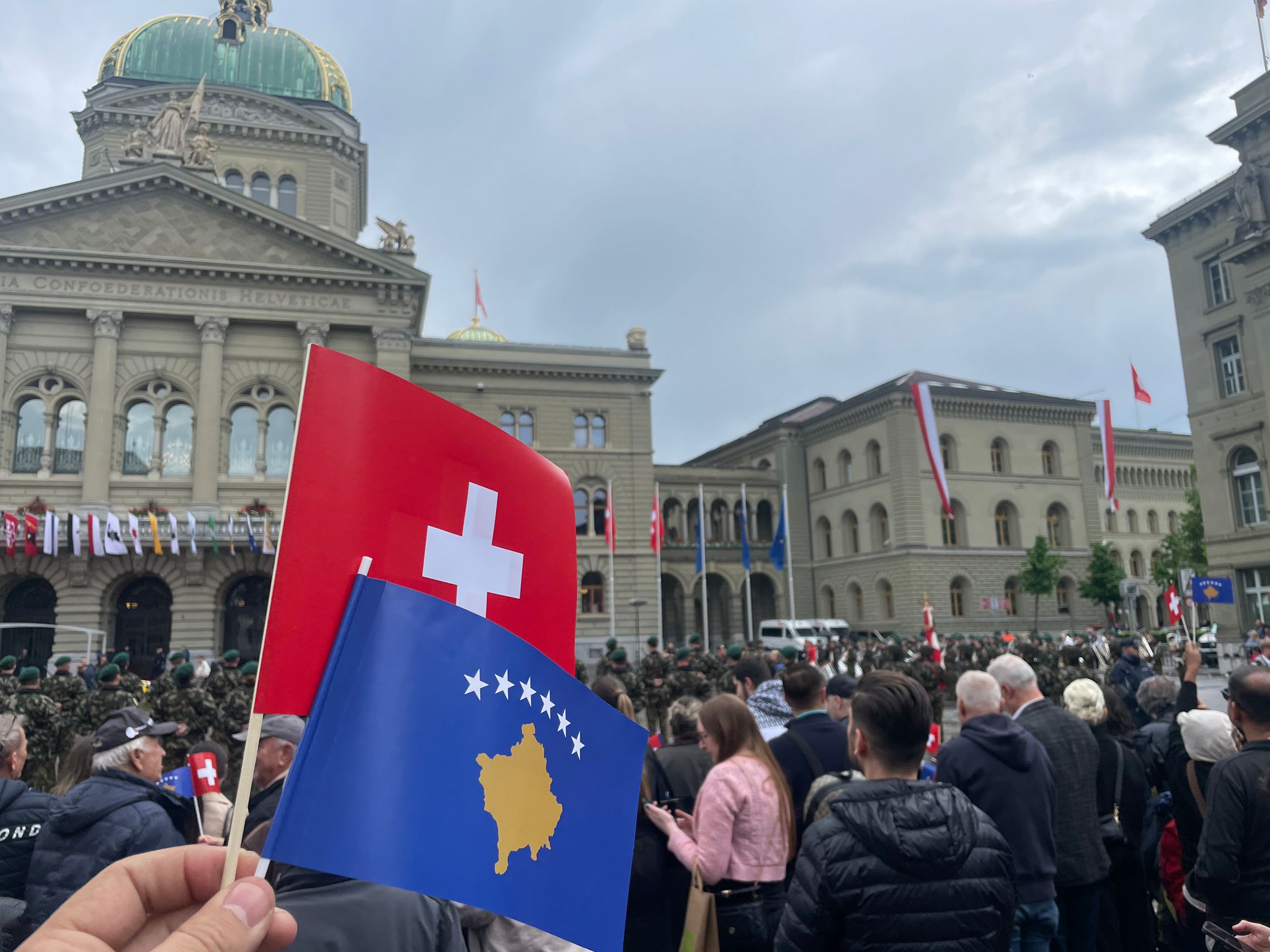 Në një ditë të shënuar nga solemniteti, emocionet dhe simbolika e përkatësisë së dyfishtë, sheshi historik Bundesplatz në zemër të kryeqytetit zviceran u vesh me ngjyrat e flamurit të Kosovës dhe të Zvicrës, në pritjen zyrtare të Presidentes së Republikës së Kosovës, Dr. Vjosa Osmani, nga Presidentja e Konfederatës Helvetike, Karin Keller-Sutter.