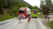 Aty shihet se si një kamion ndalet në sekondat e fundit...