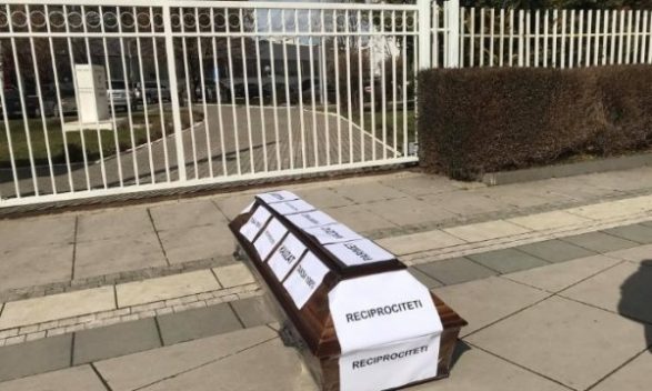 Kryeministrit të Kosovës, Albin Kurti, ia vendosin një arkivol para derës hyrëse të Qeverisë.