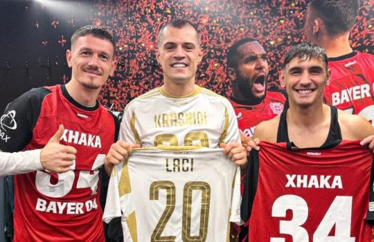 - Tre futbollistët shqiptarë shkëmbejnë fanellat e tyre pas ndeshjes futbollistikeGranit Xhaka shkëmbeu fanellat me lojtarët shqiptarë të Sparta Pragës, Ermal...