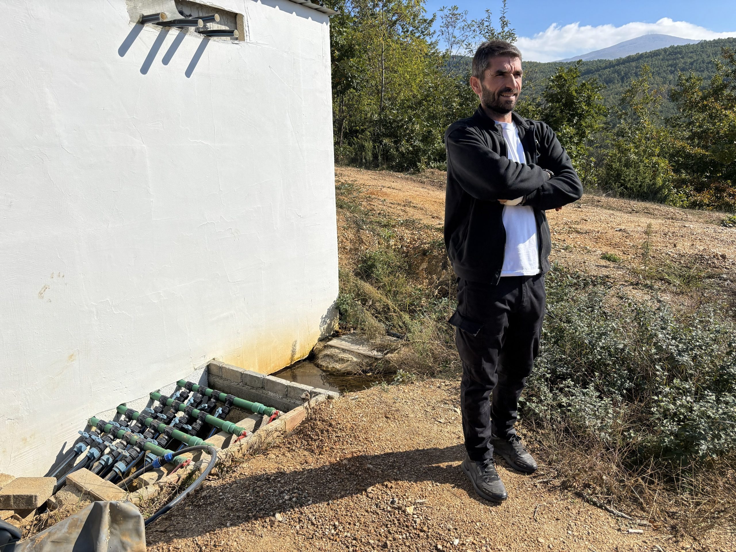 Muhamet Sallauka devant les installations de filtrage de l’eau alimentant les bassins de pisciculture aménagés sur son domaine agricole de Budakovë, dans la région de Suharekë.