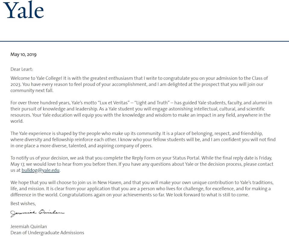 Më poshtë gjeni letrën e pranimit të Leart Ajvazajt në këtë universitet.