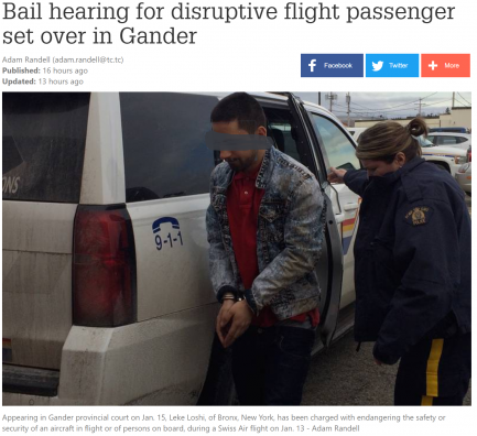 Më 13 janar, aeroplani i Kompanisë Ajrore të Zvicrës „Swiss“ që po fluturonte nga Nju Jorku drejt Cyrihut të Zvicrës, qe detyruar të aterronte në aeroportin “Gander” në Neufundland të Kanadasë. Stafi i aeroplanit kishte vemdosur të ndalonte për shkakun se një pasagjer ishte “rebeluar” gjegjësisht me sjelljet e tij problematike ishte bërë pengesë për fluturimin e mëtejmë.