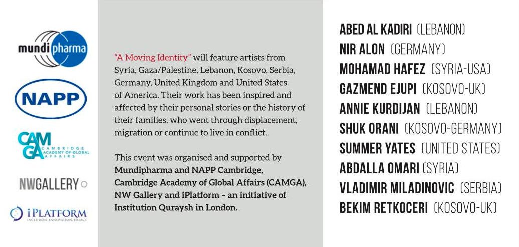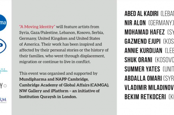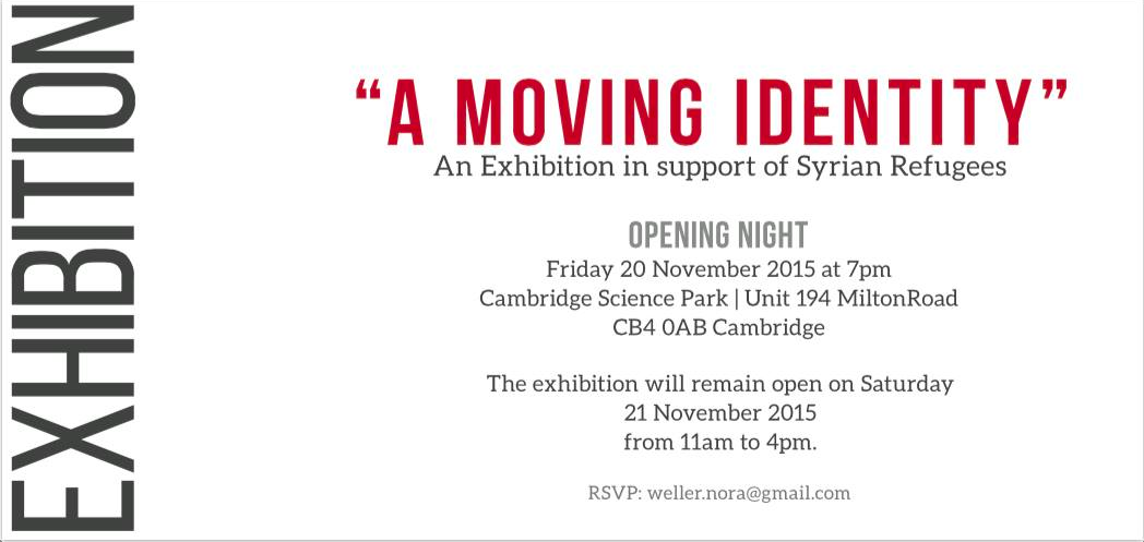 Në përkrahje të refugjatëve sirianë, në Cambridge të Britanisë së Madhe do të hapet ekspozita “A Moving Identity”. Dy ditë, më 20 dhe 21 nëntor, dashamirët e artit do të kenë rastin të shohin punimet e artistëve nga shtete të ndryshme, si: Kosova, Siria, Palestina, Libani, SHBA, Serbia, etj.