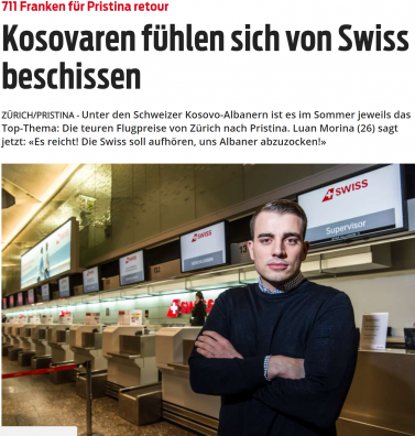 Luan Morina është një i ri shqiptar nga Zvicra. Ai ka inicuar një ndërmarrje interesante: të luftojë kundër çmimeve të larta të biletave të aeroplanëve që qarkullojnë në linjat Cyrih-Prishtinë-Cyrih. Dhe, në shënjestër të fushatës së tij Luani ka kompaninë ajrore zvicerane “Swiss”, e cila siç thotë ai, duke pasur monopolin, mban përgjegjësinë për këto çmime të larta.