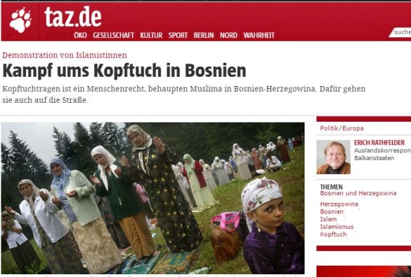 Nje demonstratë e grave islamiste ka ndezur në Sarajevë debatet lidhur me raportin në mes të shtetit dhe shoqërisë. Më 20 janar të këtij viti Gjykata Kushtetuese e Bosnjë dhe Hercegovinës pati vendosur që të mos lejohet bartja e simboleve fetare para gjyqit, shktruan taz.de, me penën e njohësit të shquar të rrethanave ballkanike, korrespondentit, Erich Rathfelder.