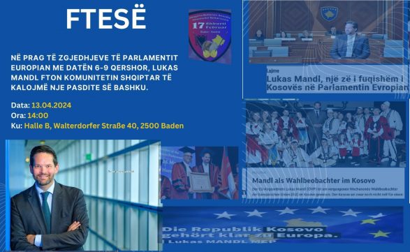 Me datën 13 prill, nga ora 14:00 në Baden, Lukas Mandl fton komunitetin shqiptar në Austri për një takim informues rreth zgjedhjeve në Parlamentin Evropian.