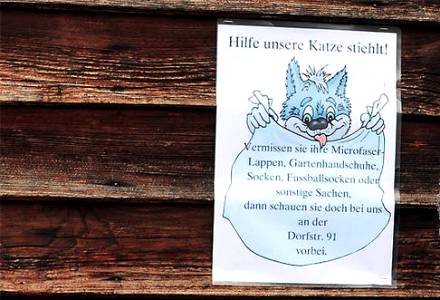 në rrethojën e oborrit familja e maces ahjneshë kanë vendosur një pllakat ku kanë shkruar: "Ndihmë! macja jonë po vjedh"