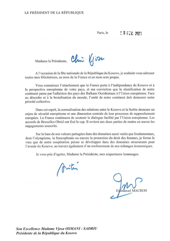 Presidenti i Francës, Emmanuel Macron, i ka dërguar një letër urimi Presidentes së Republikës së Kosovës, Vjosa Osmani-Sadriu, me rastin e 18-vjetorit të Pavarësisë së Kosovës, përcjell albinfo.ch.
