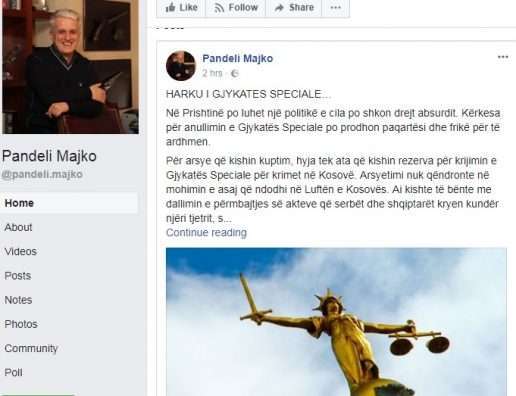 Ish-kryeministër i Shqipërisë në Kohën e luftës në Kosovë dhe tash ministër i Diasporës në Qeverinë Rama2, Pandeli Majko ka shkruar në llogarinë e tij në Facebook se tendenca për ta zhbërë Gjykatën Speciale tani është një politikë që po shkon drejt absurdit, transmeton albinfo.ch.