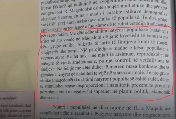 Nxënësit maqedonas të vitit të dytë në arsimin e mesëm nga libri i Sociologjisë mësojnë se shqiptarët, turqit e romët lindin shumë fëmijë, pasi siç thuhet, një përqindje shumë e madhe e kësaj popullsie nuk është e arsimuar, nuk kanë kontroll të lindjeve, andaj edhe përqindja e natalitetit të tyre është shumë më e lartë në raport me maqedonasit.