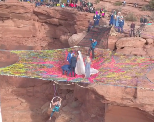 Të rrethuar nga kanionet, ceremonia pati artistë të cilët performuan për çiftin në litar.