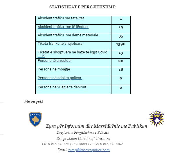 Në raportin 24 orësh të Policisë së Kosovës bëhet kanë ndodhur 54 aksidente, një me fatalitet, 19 me të lënduar dhe 35 aksidente me dëme materiale, njoftojnë mediat kosovare, transmeton albinfo.ch.