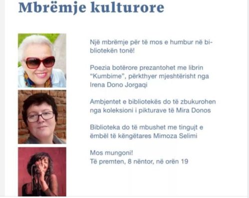 Të premten, më 8 nëntor, me fillim nga ora 19:00, në bibliotekën “Pestalozzi” në PBZ Hardau të Cyrihut do të ketë një mbrëmje të veçantë poetike dhe artistike. Bëhet fjalë për promovimin e librit “Kumbime”, me përkthime të poezive nga letërsia botërore, të përkthyeses së dëshmuar letrare, Irena Dono Jorgaqi.
