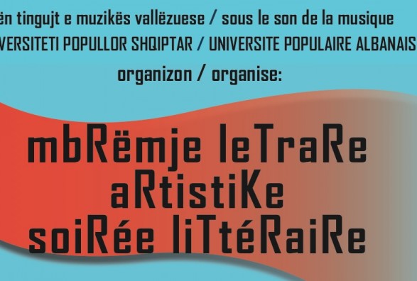 Nën tingujt emuzikës vallëzuese / sous le son de la musique UNIVERSITETI POPULLOR SHQIPTAR / UNIVERSITE POPULAIRE ALBANAISEorganizon / organise:Mbrëmje Letrare aRtistiKe soiRée liTtéRaiReBesa MYFTIU prezanton poetin e ri/présente le poète: Ndriçim ADEMAJE premte/ vendredi 26 tetor/octobre ora/ heure 19.00 salla/salle:Daniel Marco, 5, chemin Surinam, 1203 GenèvePoezi në shqip dhe frengjisht/ Lecture de poé- sies en albanais et français, Pjesë muzikore dhe mbrëmje vallëzimi/ Intermède musicale et soi- rée dansante en fin de soirée. Me violin- istin/ Avec le violoniste Volf Haxhiaj dhe grupin e varietesë shqiptare/ et le groupe de variété albanaise «ILIRËT» Aperitiv me shijet e Ballkanit/ Apéro aux goûts des Balkans.Hyrja e lire