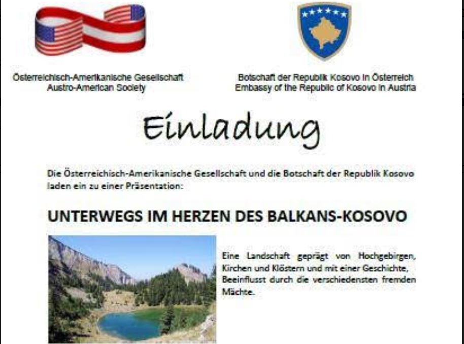 Më 23 shtator 2016, duke filluar nga ora 19:30, Ambasada e Republikës së Kosovës në Austri dhe Shoqata austriake-amerikane në Vjenë, organizojnë mbrëmje kulturore”, thuhet në ftesën e Ambasadës së Republikës së Kosovës.
