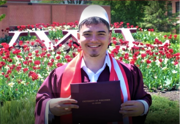 I veshur me plis në kokë e me flamur kombëtar, Shkëmbimi ka marrë pjesë në ceremoninë e diplomimit në Wisconsit të Amerikës.