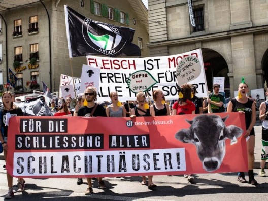Të shtunën në Bernë, rreth gjashtëqind persona kanë protestuar duke kërkuar mbylljen e të gjitha thertoreve në Zvicër.