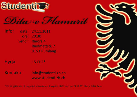 Me rastin e Ditës së Flamurit grupi punues i shoqatës organizon një mbrëmje festive që do të mbahet ditën e Enjte me datën 24. nëntor 2011. Ju ftojmë të gjithëve, studente e studentë me shoqeri, të festojmë së bashku përvjetorin 99 të pavarësisë tonë !
