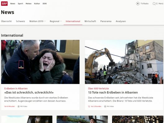 Ngjashëm, në ballinën e saj të lajmeve ndërkombëtare e ka vendosur edhe portali i radiotelevizionit publik zviceran SRF lajmin me ilustrime nga pasojat e tërmetit, shkruan albinfo.ch. Edhe ky portal bën freskimin e lajmeve në kohë reale.