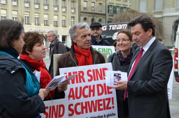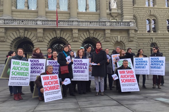 “Me rastin e debatit të nesërm mbi zbatimin e iniciativës dëbuese në Parlamentin e Zvicrës, një numër i madh i organizatave të migrantëve i kanë dorëzuar kryetarit të parlamentit Stéphane Rossini një rezolutë kundër dëbimit të njerëzve që janë rritur në Zvicër. Kjo rezolutë është aprovuar nga Kongresi i parë i migranteve e migrantëve dhe njerëzve me sfond migracioni, të mbajtur më 7 shkurt 2015 në Bernë.