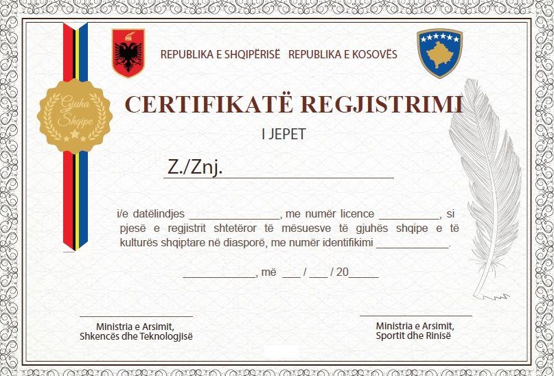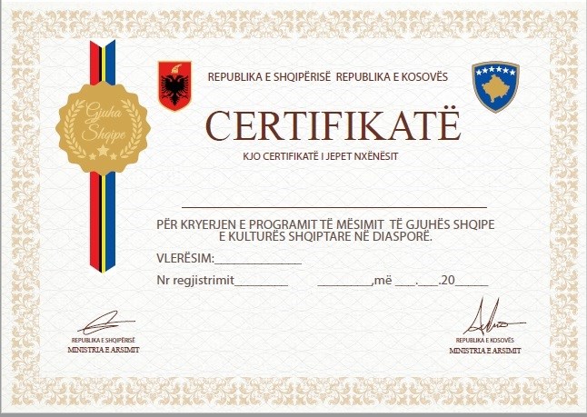Në bazë të marrëveshjes “Për organizimin e përbashkët të mësimit të gjuhës shqipe dhe kulturës shqiptare në diasporë dhe mërgatë”, datë 23.03.2015 ministria përgjegjëse për arsimin gjithashtu do të përgatisë certifikatën për nxënësit që përfundojnë programin e mësimit të gjuhës shqipe e të kulturës shqiptare në Diasporë.