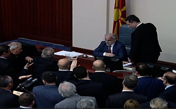 Pak pas votimit, kryeparlamentari nga radhët e BDI, Talat Xhaferi, u përplas me ish liderin e VMRO, Nikola Gruevski. Sigurimi i Kuvendit, edhe pse me vonesë, pengoi një përplasje fizike mes kryeparlamentarit Talat Xhaferi dhe Nikolla Gruevski. Gruevski është ngjitur lartë në foltore dhe ka kërkuar nga Xhaferi që ta ndërpresë punën e Kuvendit. Gjatë këtij momenti vërehen shtyerje me dorë ndaj njëri-tjetrit.
