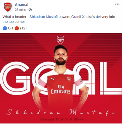 Mbrojtësi shqiptar i cili luan për Arsenalin, Shkodran Mustafi ka shënuar gol pas asistit nga ana e sqiptarit tjetër Granit Xhaka.
