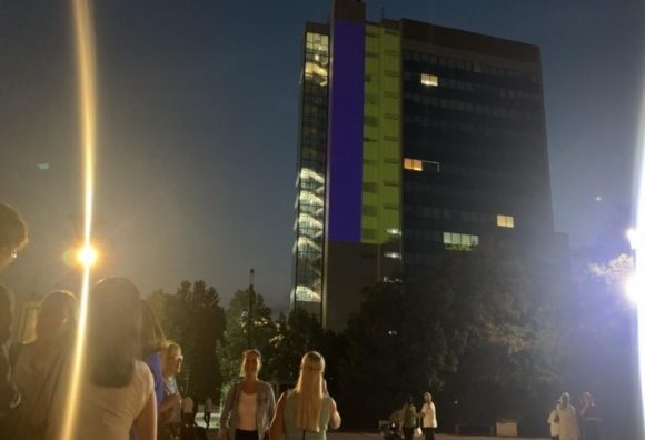 Ndërtesa e Qeverisë së Kosovës ndriçohet me ngjyrat e flamurit të Ukrainës