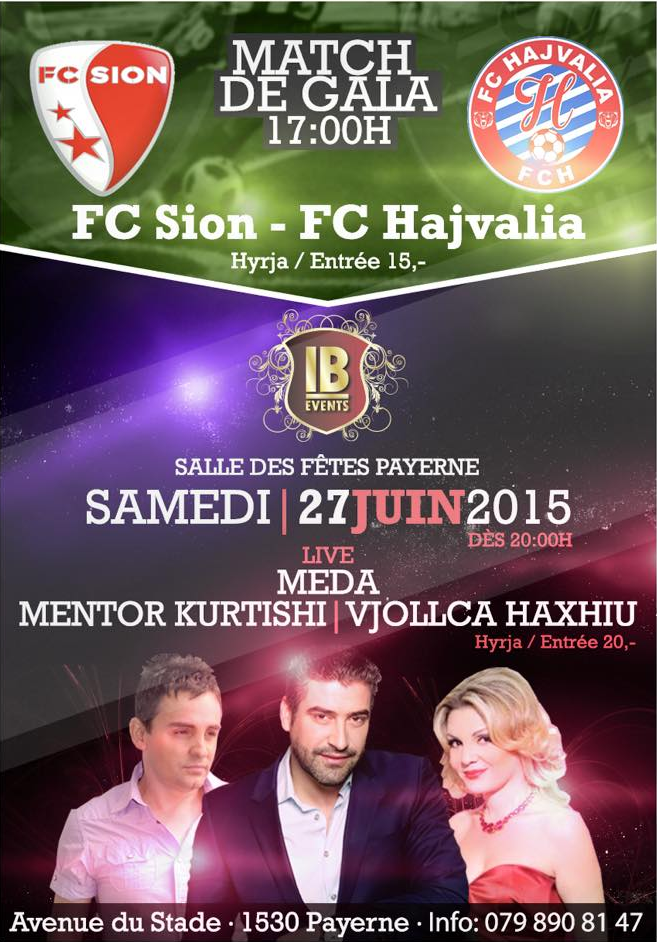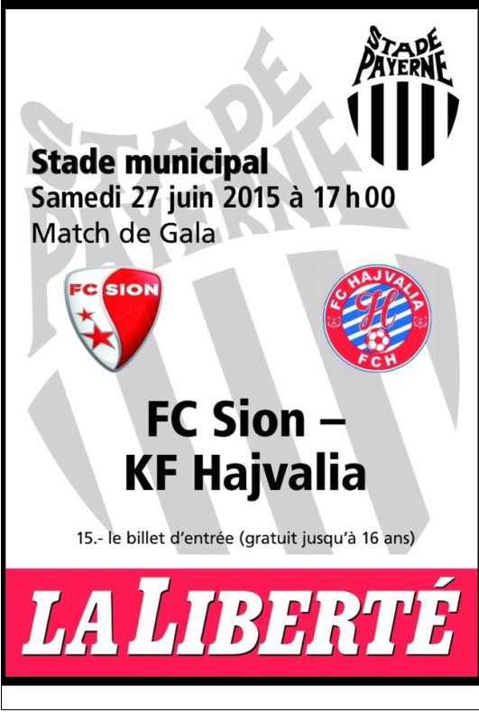 Klubi futbollistik “Stade Payerne” se bashku me klubin futbollistik shqipëtar “FC Iliria Payerne” organizojm ndeshjen gala mes dy ekipeve të Superligës zvicërane dhe atë të Kosovës (FC Sion – KF Hajvalia). Ky manifestim mbahet ditën e Shtunë 27.06.2015 në ora 17h00 në Stade Municipal, 1530 Payerne (VD).