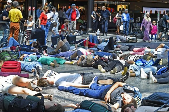 Për disa momente ata kanë qëndruar të shtrirë në tokë, e më pas kanë ecur përgjatë zonës së blerjeve dhe kanë shpërndarë fletushka, përcjell në shqip albinfo.ch.